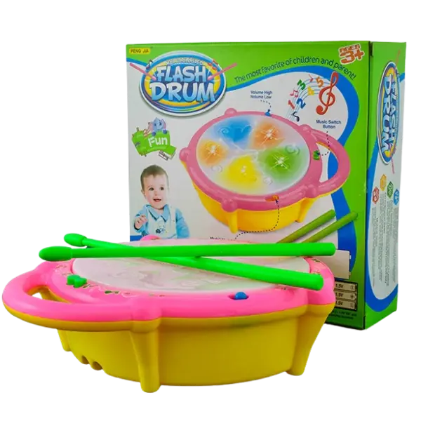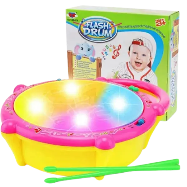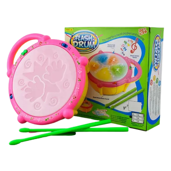 An interactive, battery-powered flash drum with colorful LED lights, 3 play modes, 9 cheerful tunes, 9 drum sounds, and volume control. Comes with two drumsticks for hands-on fun—perfect for promoting early musical interest, auditory and visual stimulation, and coordination for children aged 3 and up.